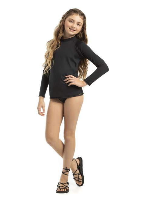 Camiseta Infantil Unissex de Proteção UV com fator de proteção UV 50+. Modelagem alongada com manga raiglan e gola. Seu tecido é tecnológico e de alta qualidade, o que proporciona maior liberdade de movimentos, proteção solar e conforto térmico, ajuste perfeito ao corpo, além de maior durabilidade da peça, mesmo com uso constante em piscinas ou contato com a água do mar. Possui decote com gola em U, mangas modelo raiglan sem forro, com bainha nos punhos e barra da camiseta.