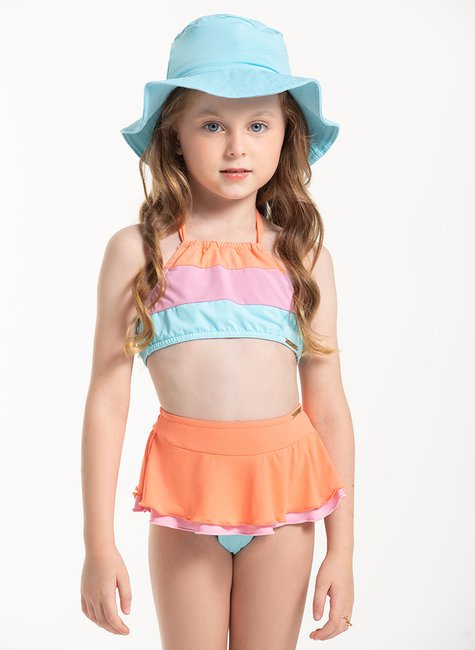 Sua modelagem foi desenvolvida visando um maior conforto das crianças ao vestir a peça. O top do biquíni possui alças livres, sendo amarrado no pescoço e costas, facilitando o ajuste ao corpo.A calcinha do biquíni conta com dois babados e sua modelagem é mais alta na cintura e maior no bumbum, proporcionando maior cobertura do corpo e conforto. Cobertura do bumbum: Alta