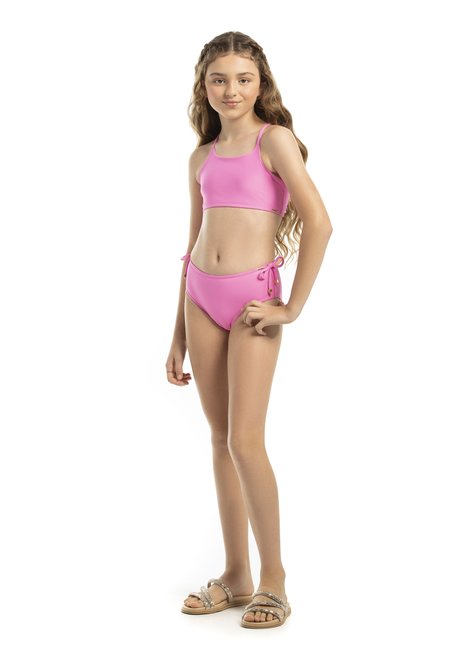 Conjunto Biquíni Frente Única é a combinação perfeita de conforto, estilo e segurança para as meninas curtirem os dias de sol! O top possui modelagem esportiva estilo nadador, com alças que se cruzam nas costas, proporcionando mais firmeza durante o uso e liberdade de movimento. A calcinha tem laterais mais largas com detalhe de amarração, garantindo um ajuste confortável ao corpo e um toque delicado ao visual.
