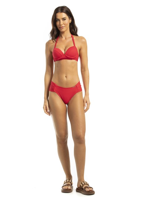 Esta peça possui modelagem um pouco mais alta na frente e maior no bumbum, ideal para quem busca mais conforto. As laterais drapeadas não marcam no corpo e auxiliam no ajuste da peça ao corpo. Possui acabamento com etiqueta da marca em metal banho ouro light.