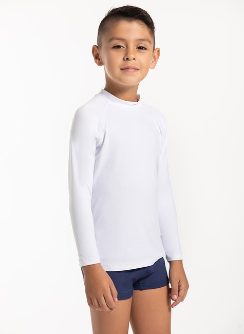 Camiseta Infantil Unissex de Proteção UV com fator de proteção UV 50+. Modelagem alongada com manga raiglan e gola. Seu tecido é tecnológico e de alta qualidade, o que proporciona maior liberdade de movimentos, proteção solar e conforto térmico, ajuste perfeito ao corpo, além de maior durabilidade da peça, mesmo com uso constante em piscinas ou contato com a água do mar. Possui decote com gola em U, mangas modelo raiglan sem forro, com bainha nos punhos e barra da camiseta.