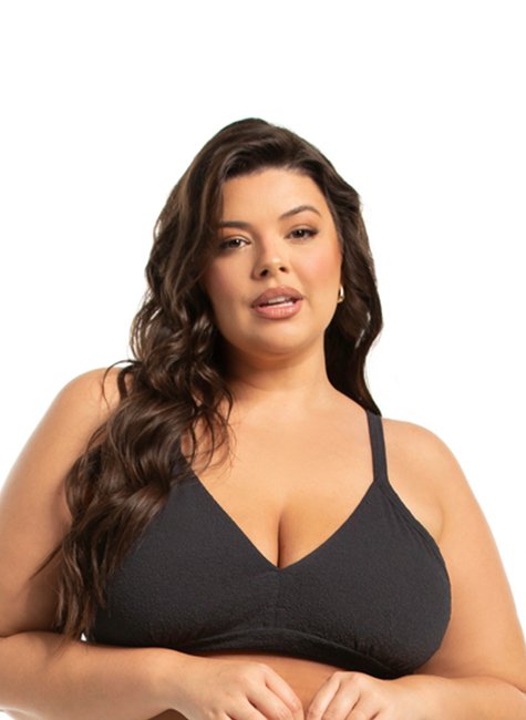 Top biquíni com alças fixas sem bojo. Possui base com reforço em tecido abaixo do busto, auxiliando na sustentação dos seios. Laterais da peça e alças mais largas, oferecendo uma cobertura maior nas laterais. O design do modelo é em formato triângulo, com decote em V, com acabamento mais fechado com costuras travete. Modelo ideal para quem tem seios maiores e necessita de maior sustentação. Oferece um conforto único, já que não tem bojo nem aro. Suas alças são fixas, retas nas costas como os modelos de sutiã, com reguladores de altura em metal banho ouro light. Amarração das costas com laço, permitindo melhor regulagem e ajuste da peça ao corpo.